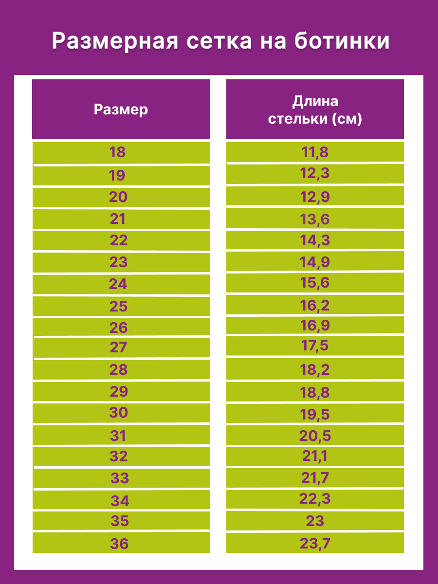 Данная модель ботинок выпускается с размерами от 19 до 35