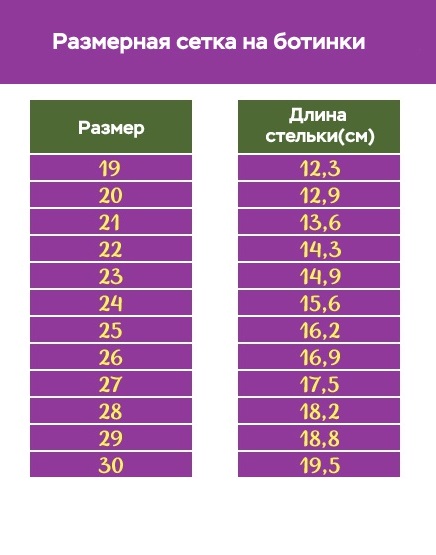Данная модель ботинок выпускается с размерами от 19 до 22
