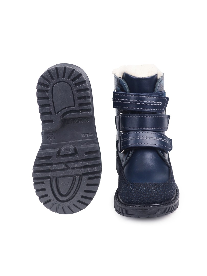 Утепленные ботинки  из натуральной кожи премиум-класса и подкладки из  шерстяного меха  согреют ножки ребенка. При выборе модели с шерстяным мехом, за счет плотности меха, рекомендуем выбирать детскую обувь на 1-1,5 размера больше. Внутри - съёмная стелька с активным супинатором. Жесткий задник надежно фиксирует голеностоп, а липучка "Велкро" помогает регулировать полноту. Умерено эластичная и прочная подошва с каблуком Томаса не скользит и хорошо поглощает ударную нагрузку, что позволяет ножкам ребенка не уставать.