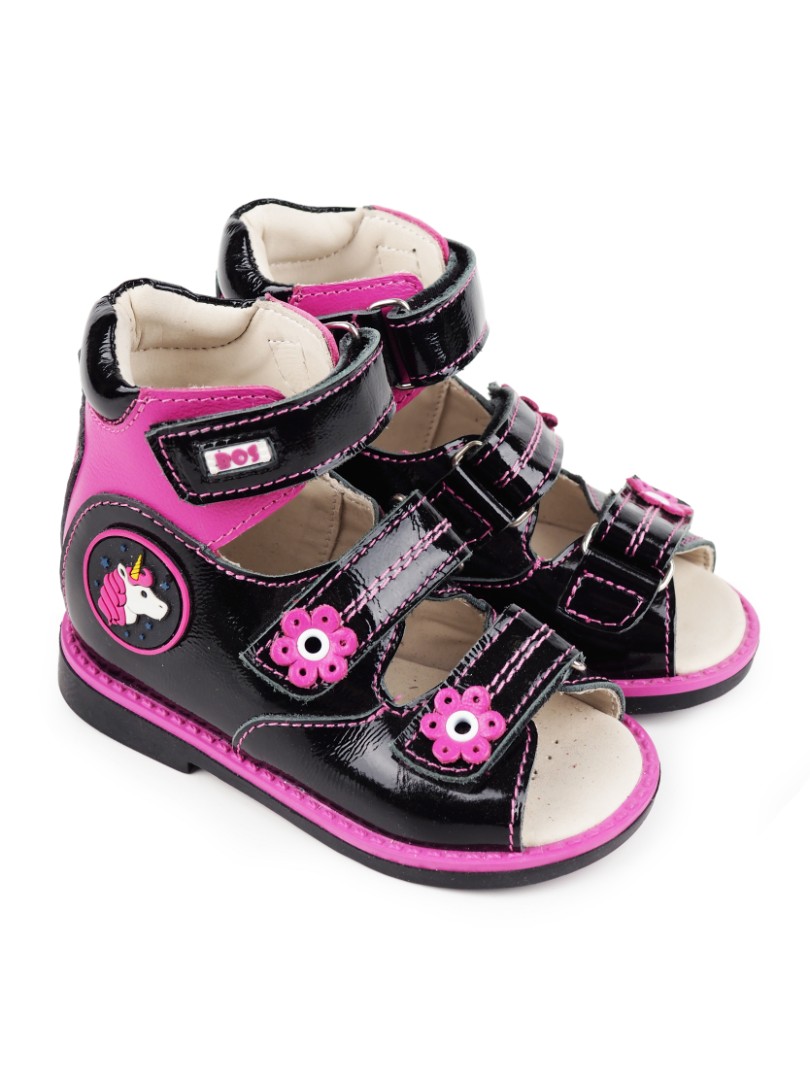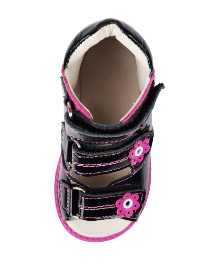 Ортопедические сандалии с высоким берцем для профилактики и коррекции плоскостопия и плосковальгусной установки стоп. Широкий, устойчивый каблук специальной конфигурации - каблук Томаса. Каблук продлен с внутренней стороны до середины стопы, чтобы исключить заваливание стопы вовнутрь, так называемая косолапость, или вальгусная деформация. Ребра жесткости до середины стопы, анатомическая стелька без супинатора, (возможна вкладка своей индивидуальной стельки) для правильного формирования свода стопы. Задник максимальной жесткости с удлиненным крылом надежно стабилизирует голеностопный сустав во время ходьбы. Упругая, умеренно-эластичная подошва, имеющая перекат, позволяет повторить естественное движение стопы при ходьбе для правильного распределения нагрузки на опорно-двигательный аппарат ребенка.