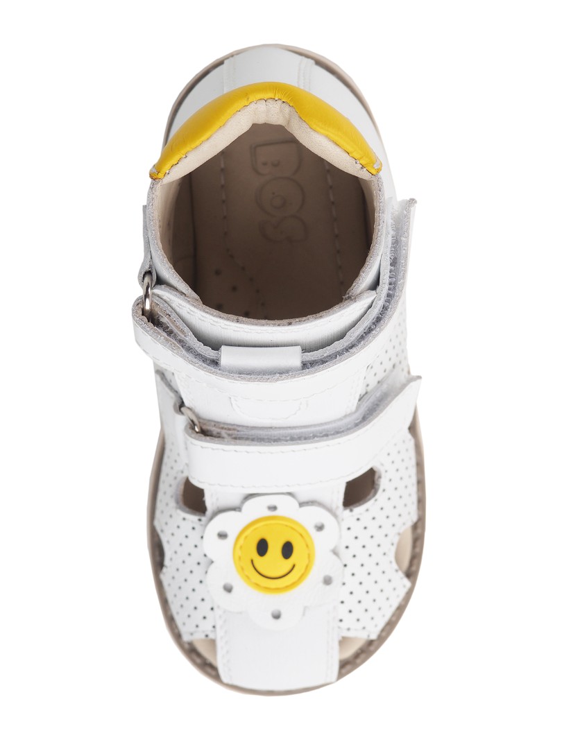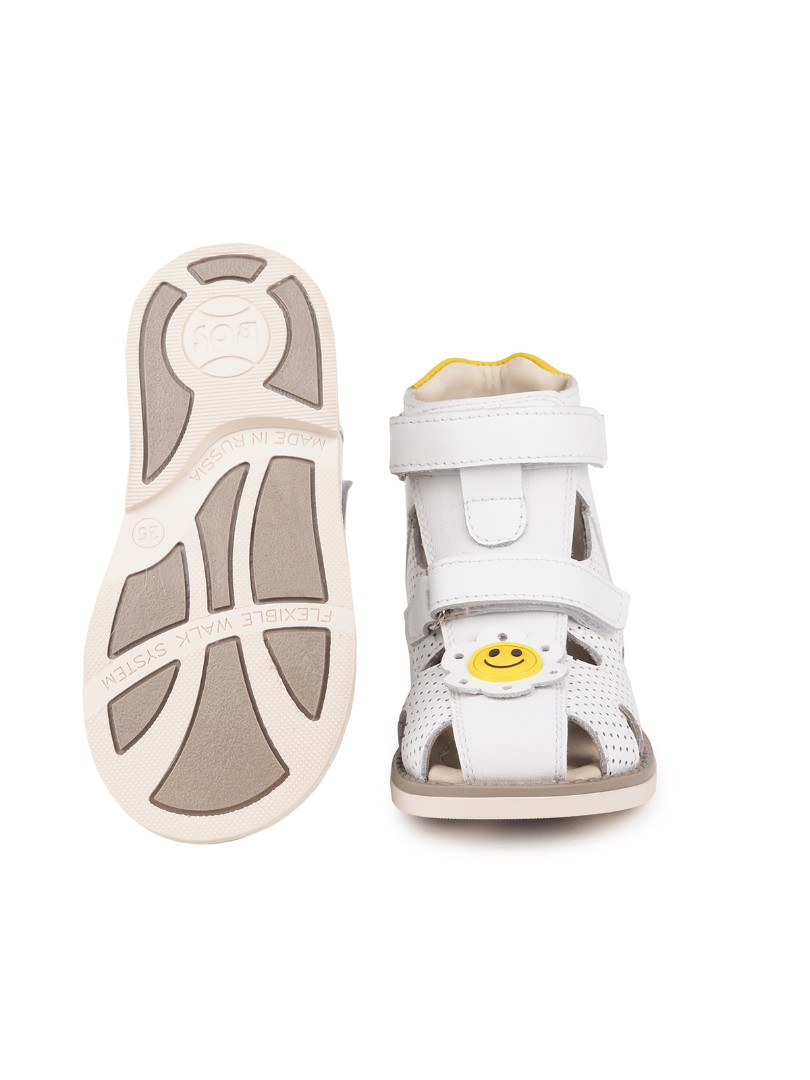 Выгодно приобрести элегантные ортопедические сандалики для девочки из белой и розовой кожи с цветочным декором предлагает фабрика BOS.