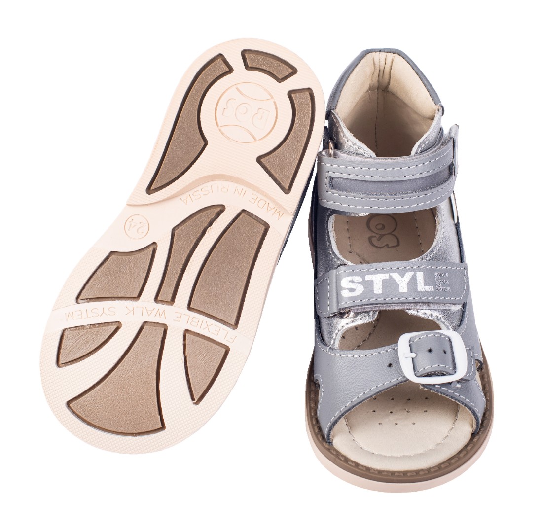 Ортопедические сандалии для профилактики и коррекции плоскостопия и плосковальгусной установки стоп. Широкий, устойчивый каблук специальной конфигурации - каблук Томаса. Каблук продлен с внутренней стороны до середины стопы, чтобы исключить заваливание стопы вовнутрь, так называемая косолапость, или вальгусная деформация. Анатомическая стелька с супинатором для правильного формирования свода стопы. Задник максимальной жесткости с удлиненным крылом надежно стабилизирует голеностопный сустав во время ходьбы. Упругая, умеренно-эластичная подошва, имеющая перекат, позволяет повторить естественное движение стопы при ходьбе для правильного распределения нагрузки на опорно-двигательный аппарат ребенка.