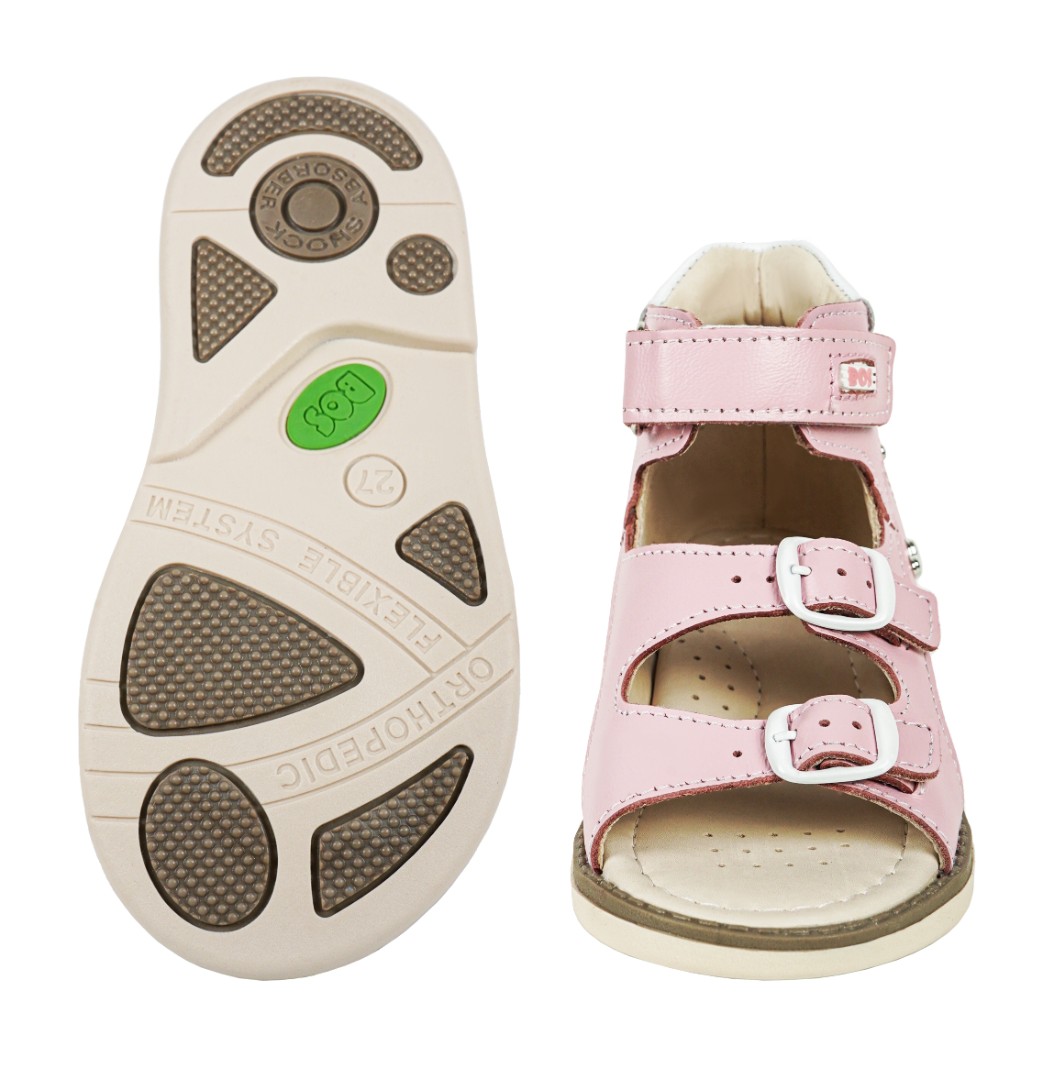 Ортопедические сандалии для профилактики и коррекции плоскостопия и плосковальгусной установки стоп. Широкий, устойчивый каблук специальной конфигурации - каблук Томаса. Каблук продлен с внутренней стороны до середины стопы, чтобы исключить заваливание стопы вовнутрь, так называемая косолапость, или вальгусная деформация. Анатомическая стелька с супинатором для правильного формирования свода стопы. Задник максимальной жесткости с удлиненным крылом надежно стабилизирует голеностопный сустав во время ходьбы. Упругая, умеренно-эластичная подошва, имеющая перекат, позволяет повторить естественное движение стопы при ходьбе для правильного распределения нагрузки на опорно-двигательный аппарат ребенка.