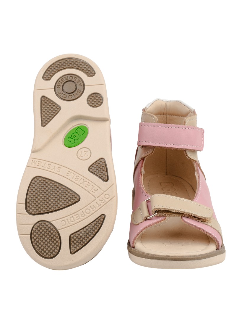 Ортопедические сандалии для профилактики и коррекции плоскостопия и плосковальгусной установки стоп. Широкий, устойчивый каблук специальной конфигурации - каблук Томаса. Каблук продлен с внутренней стороны до середины стопы, чтобы исключить заваливание стопы вовнутрь, так называемая косолапость, или вальгусная деформация. Анатомическая стелька с супинатором для правильного формирования свода стопы. Задник максимальной жесткости с удлиненным крылом надежно стабилизирует голеностопный сустав во время ходьбы. Упругая, умеренно-эластичная подошва, имеющая перекат, позволяет повторить естественное движение стопы при ходьбе для правильного распределения нагрузки на опорно-двигательный аппарат ребенка.